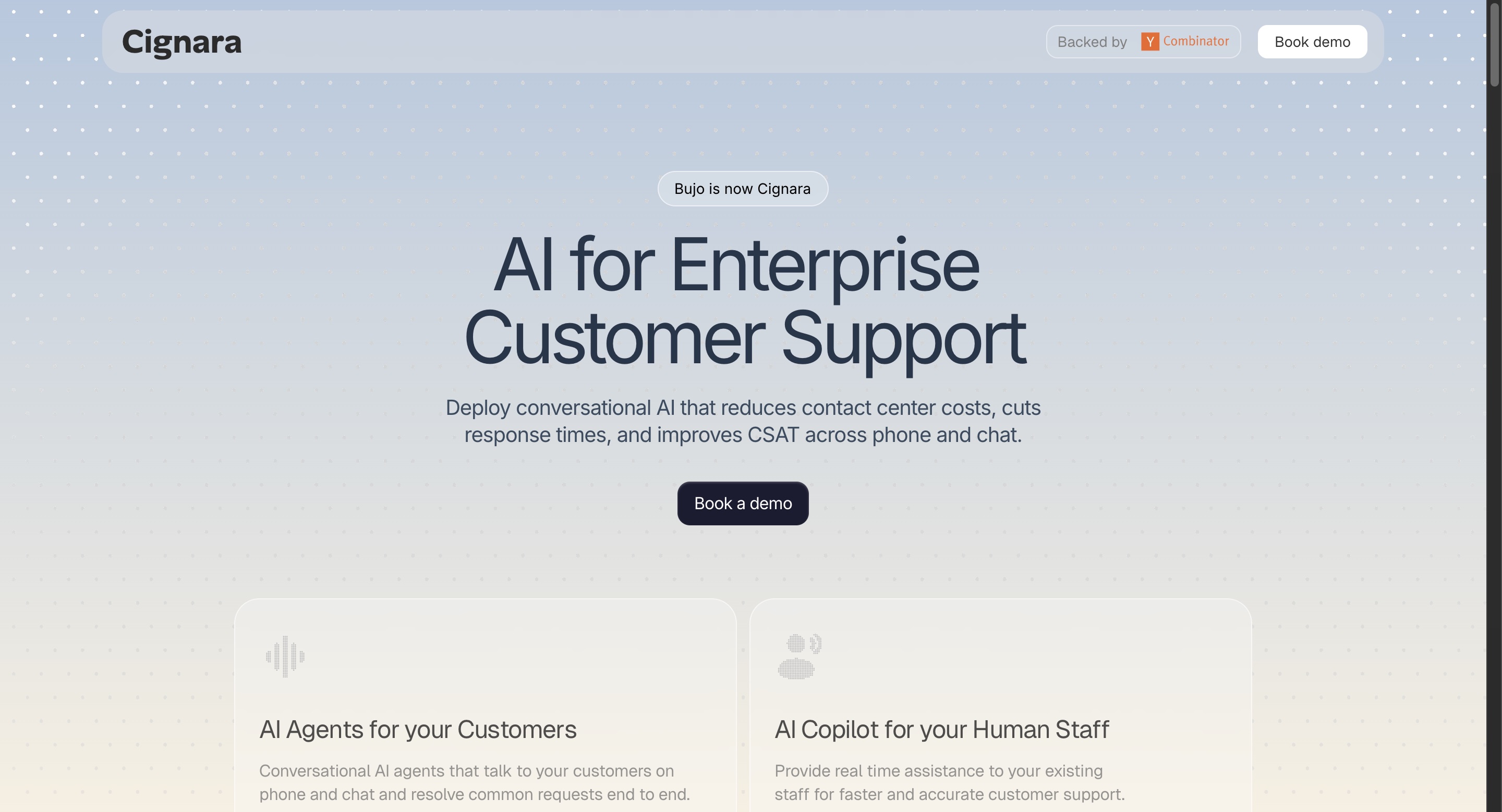 - •Cignara (formerly Bujo AI) is a YC-backed enterprise AI call center for Fortune 500 B2C consumer brands only. There is no SMB product, no self-serve signup, and no published pricing.