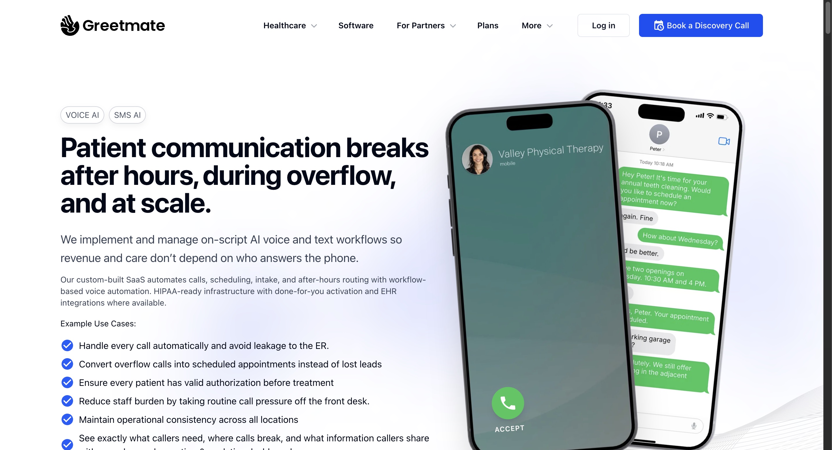Greetmate claims a 35%+ reduction in front-desk workload by automating 70-80% of routine patient communications. Sub-500ms response latency and multi-location standardization are key selling points for dental service organizations (DSOs) and medical groups. Pricing is not published. There is no self-serve signup or free trial.