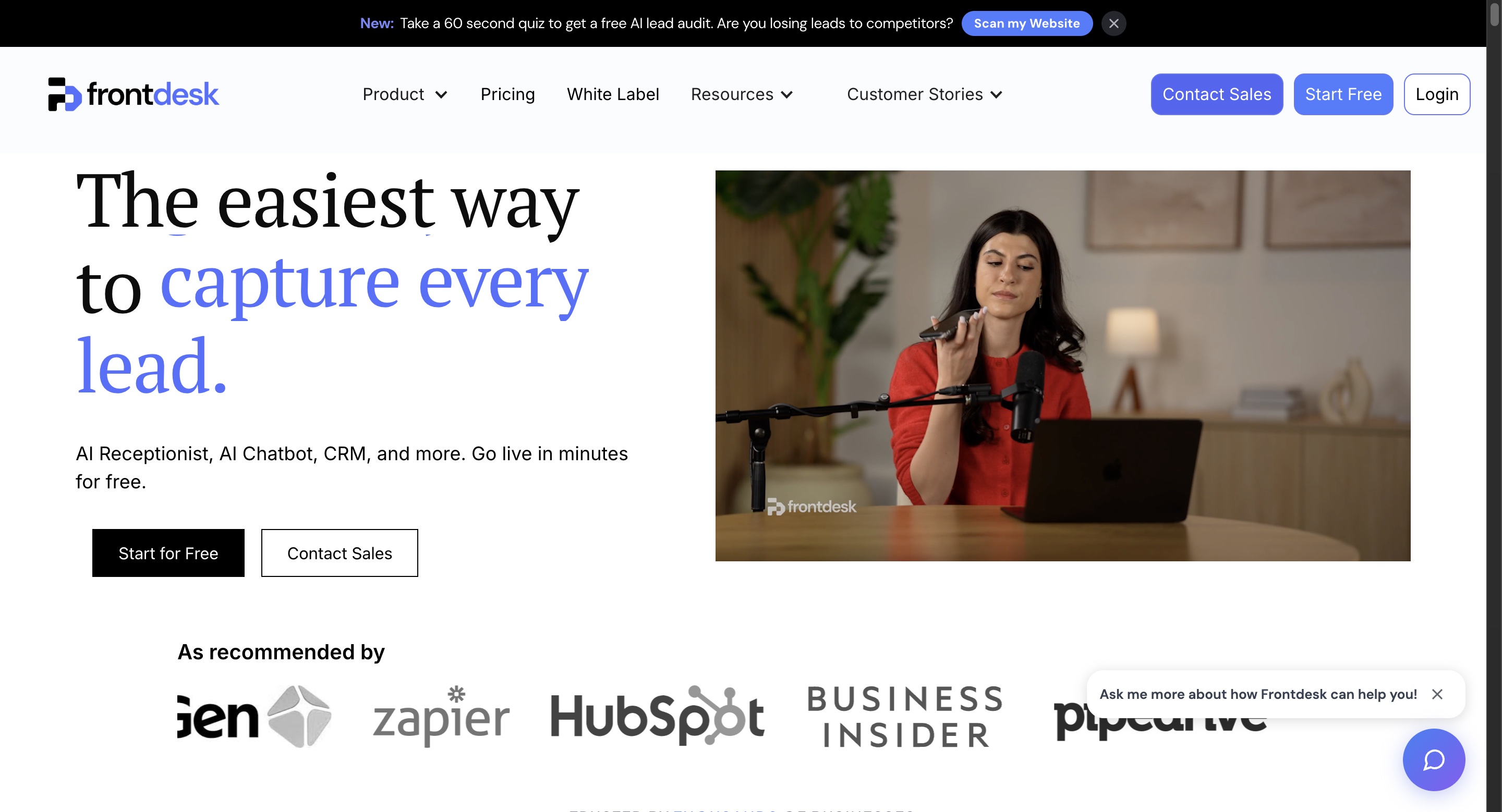 My AI Front Desk (branded as "frontdesk" inside the product) is a Berkeley-based AI platform that handles customer communications across phone, SMS, email, website chat, and forms from a single dashboard. It targets service businesses like salons, spas, real estate agents, and small agencies, with a built-in CRM and 7,000+ app integrations via Zapier.