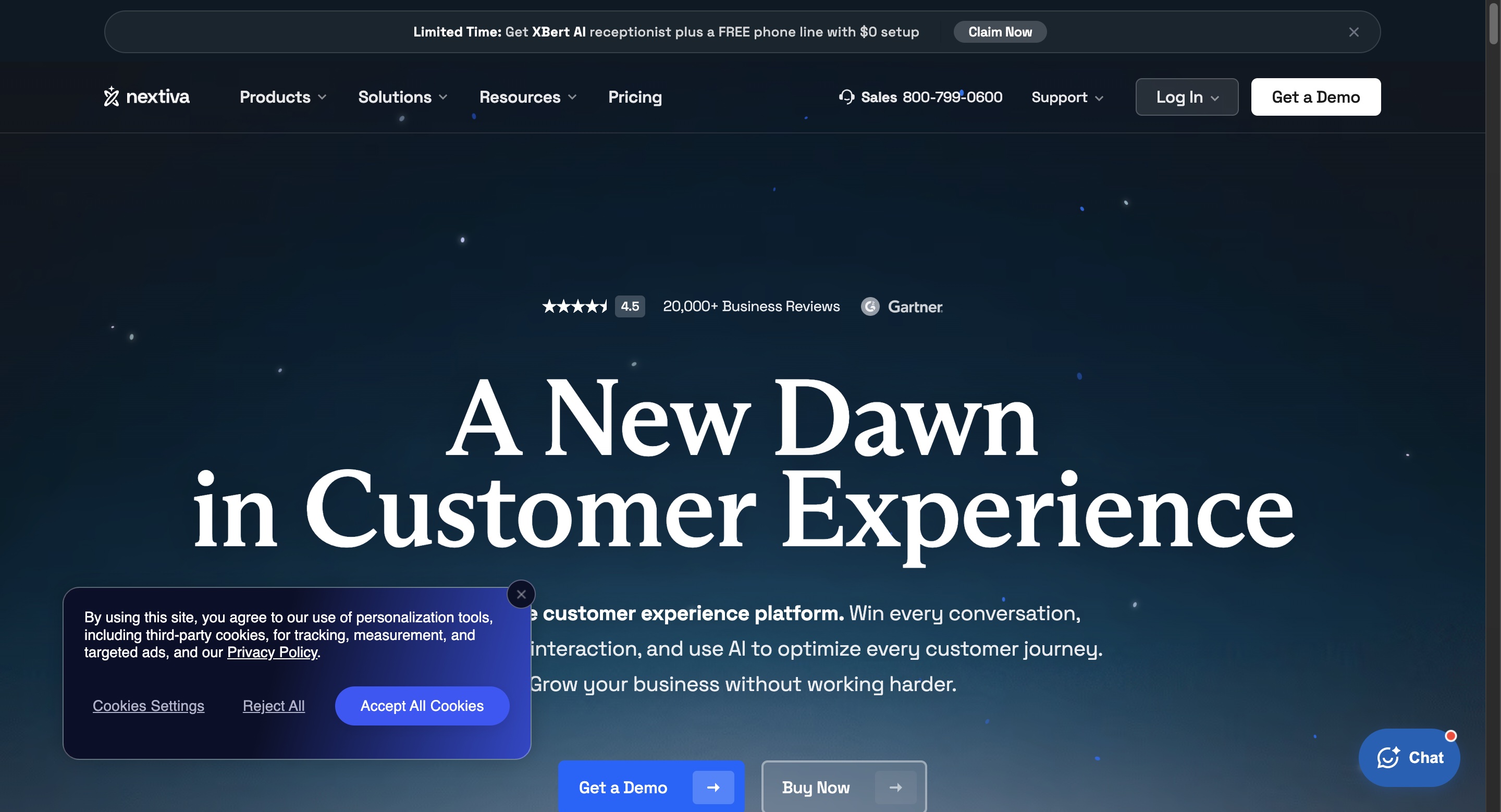 Nextiva is a Scottsdale, Arizona-based UCaaS vendor founded in 2006 with $200 million from Goldman Sachs and roughly $650 million in revenue. It is one of the largest cloud business phone providers in North America, serving hundreds of thousands of businesses. Its AI Receptionist product, branded "XBert," starts at $99/month for 100 resolutions (calls, texts, or chats) with natural conversational AI, appointment booking, call transfer with context, and CRM integration.