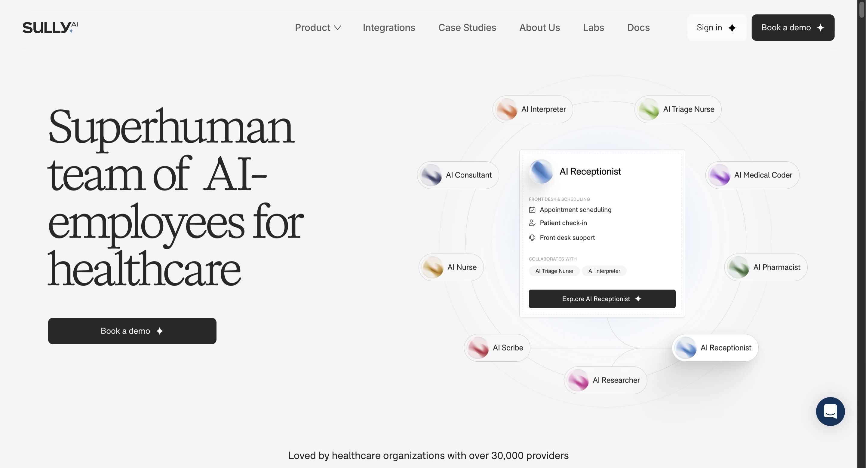 Sully AI is an AI platform that bills itself as a "superhuman team" of AI employees built exclusively for healthcare. Founded by clinicians, including Dr. Henry Duong (a former NASA technologist), Sully offers a roster of specialized agents: Receptionist, Nurse, Scribe, Coder, Triage, and Pharmacy Tech. Over 400 healthcare organizations and 30,000+ providers use the platform today.
