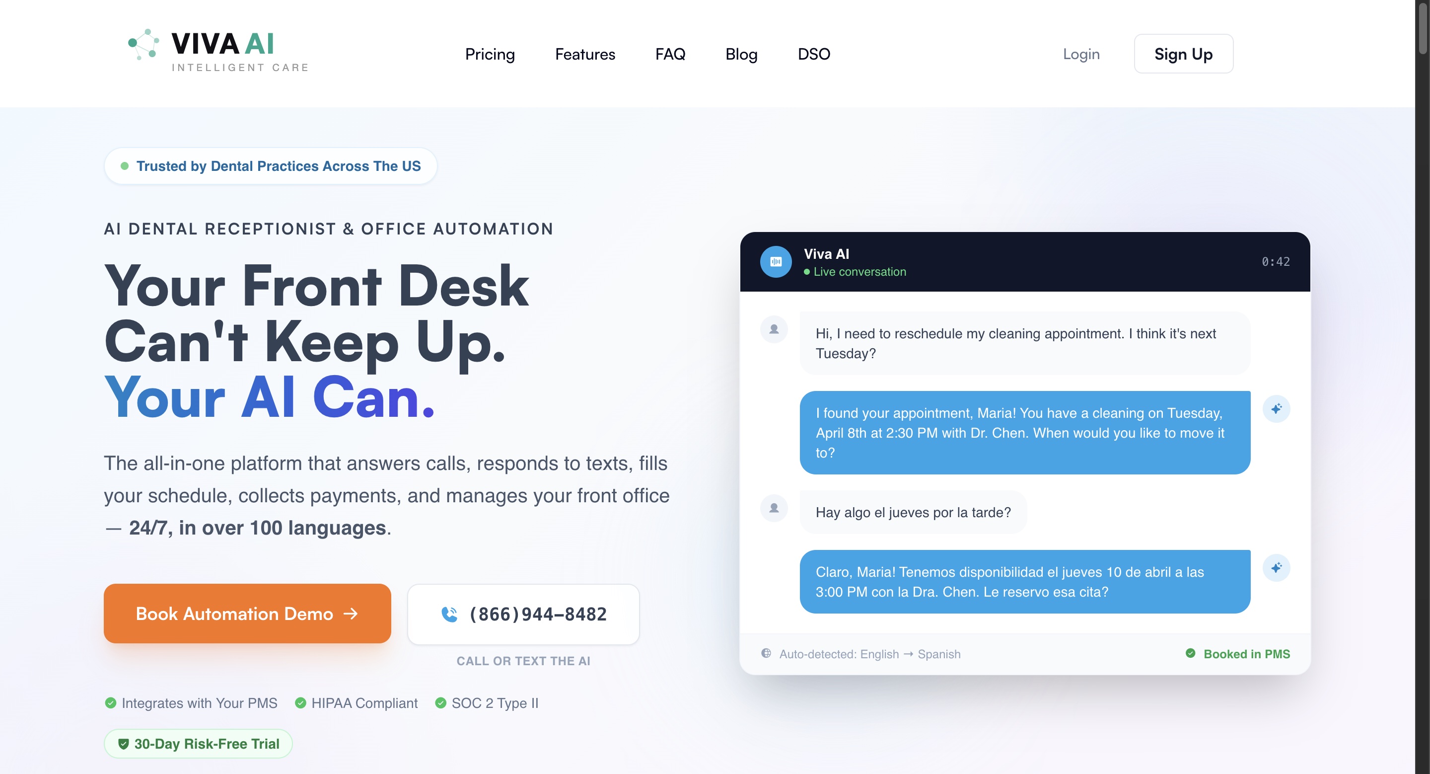 Viva AI is a San Francisco-based AI receptionist built exclusively for dental practices. Founded in 2024, it is the only AI dental receptionist with both SOC 2 Type II certification and HIPAA compliance with a signed BAA on every account. It supports 100+ languages with mid-call language switching and integrates with Dentrix Ascend, CareStack, and Cloud9.