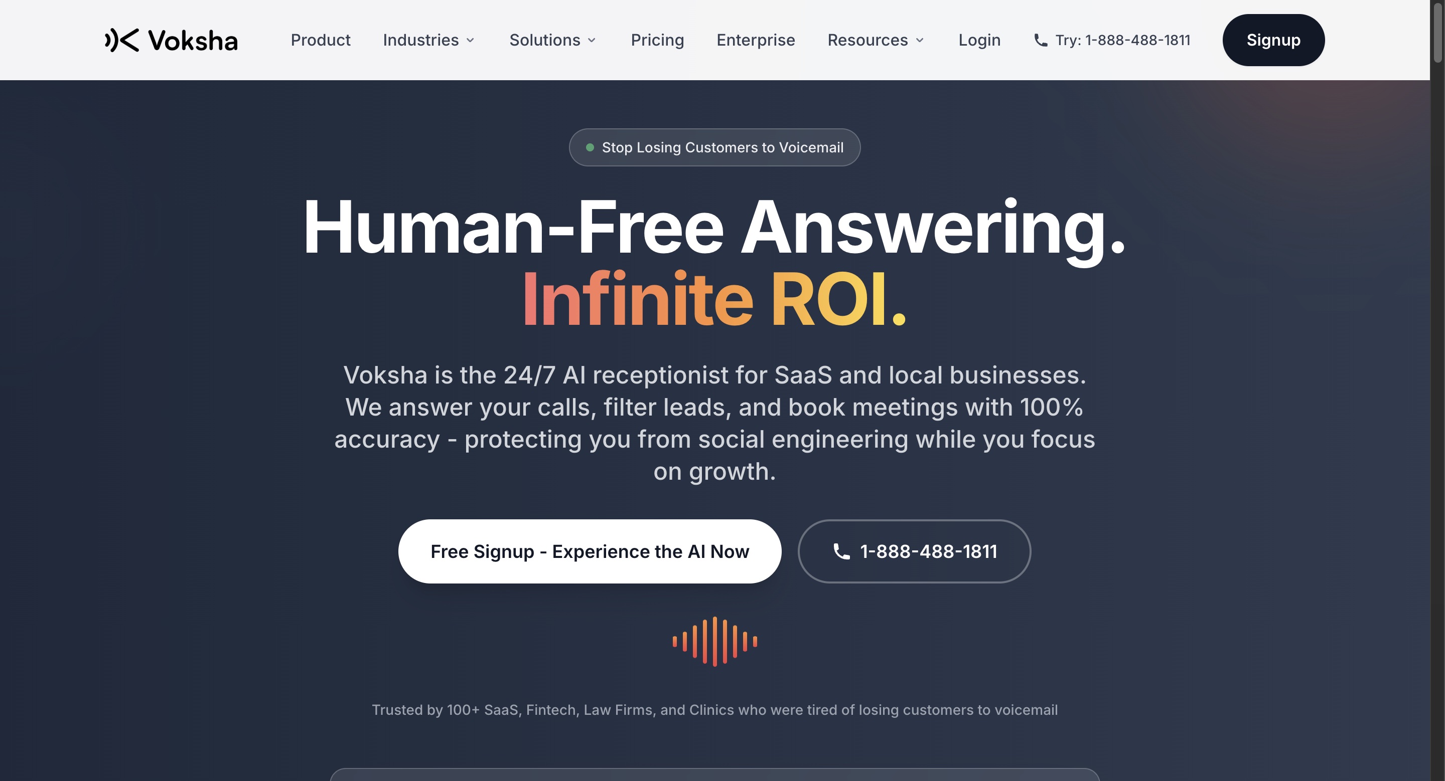 Voksha appears to be a real product with a working website, industry-specific landing pages, and a press release about an AI-Powered Call Intelligence Platform. However, the company discloses almost nothing about itself: no founding year, no headquarters, no funding details, no team information. This level of opacity is unusual even in the AI receptionist category, where many competitors are young startups.
