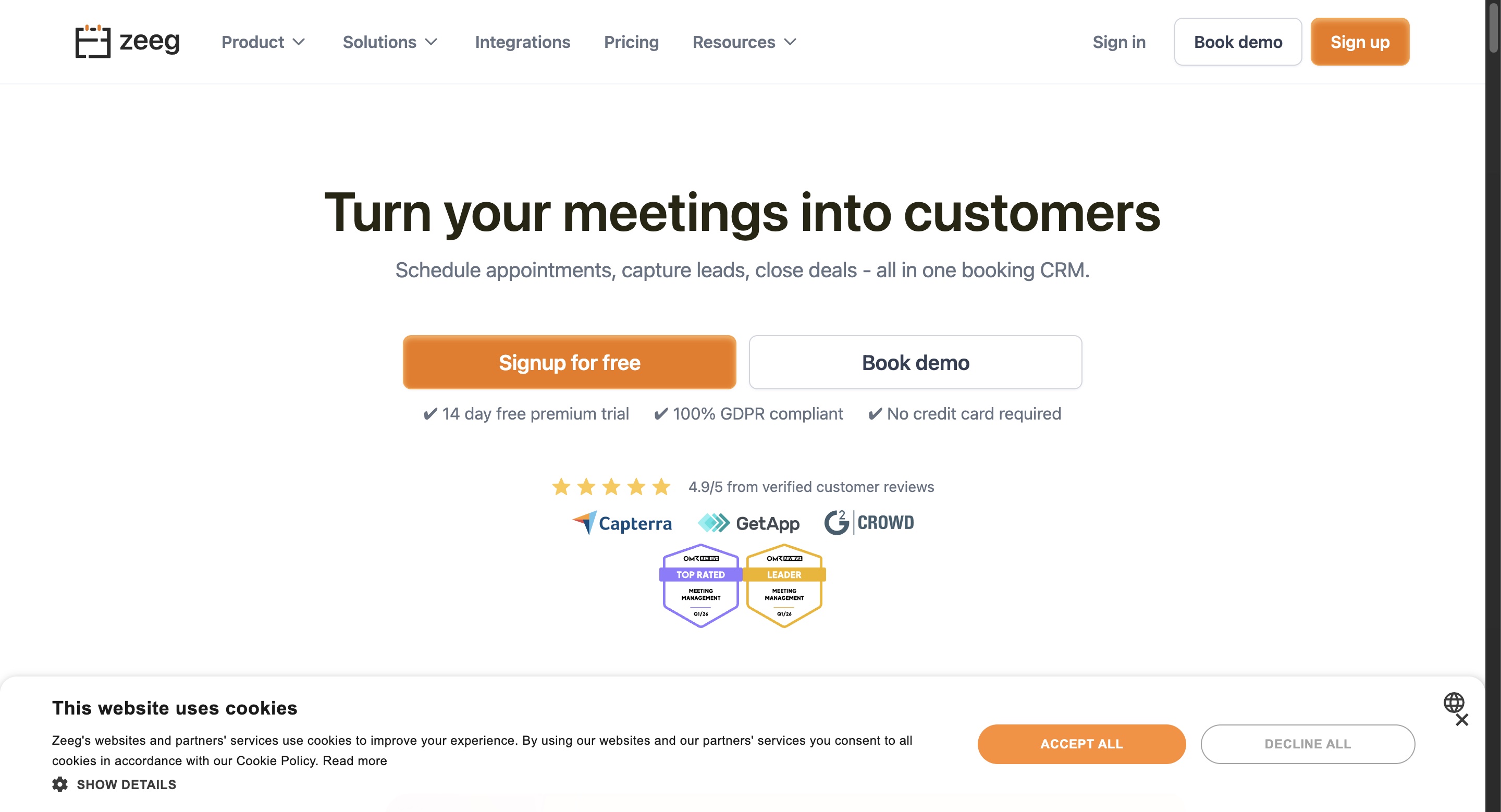 The scheduling side of Zeeg is well-established with a 4.9/5 rating on Capterra and direct integrations with Google Calendar, Apple Calendar, and Microsoft Outlook. It is 100% GDPR compliant with all data stored on European servers. The free Starter plan covers basic scheduling, while the Professional plan costs $10-12/user/month.