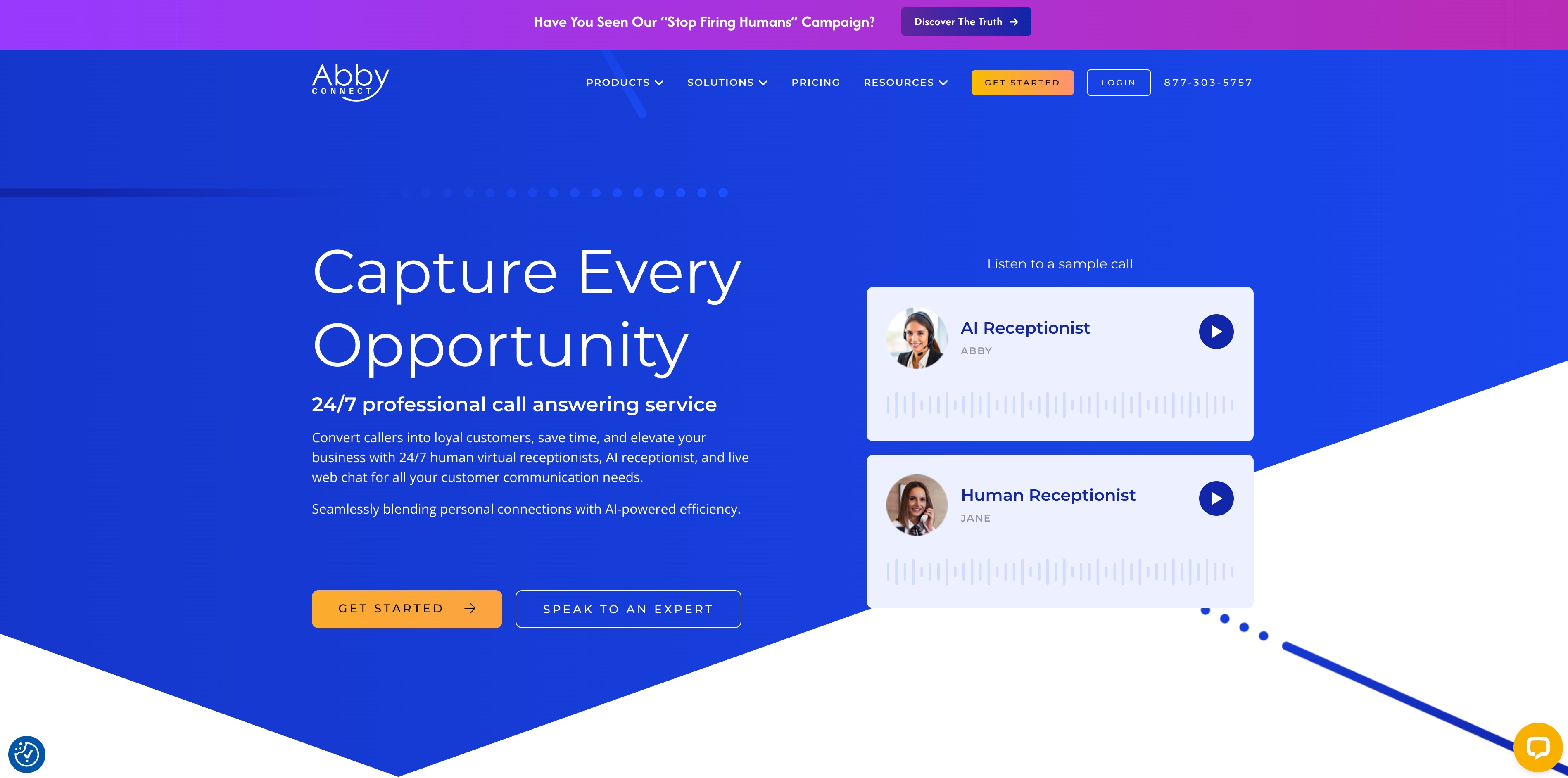 | Abby Connect | $329/mo | $599/mo | $3.29/min eff. | Live agents |